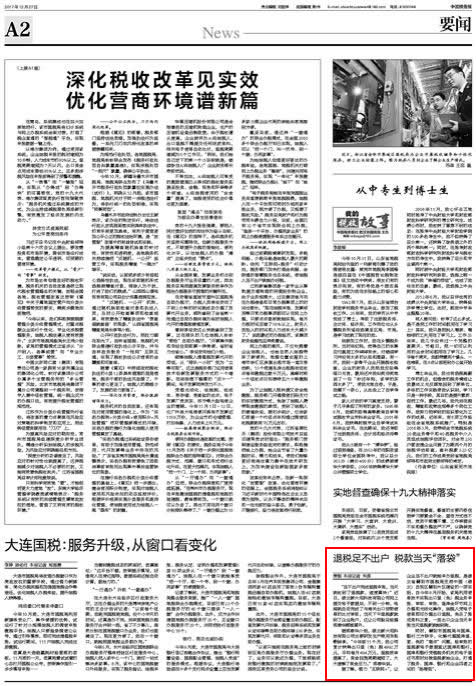 同时,襄阳市国税局与国库、银行三方联手,化解代理国库退、更、免的“堵点”问题,经审批的退税款电子数据直达国库和银行,国库和银行凭借税务机关的电子退还书即时划拨退税款给企业,打通了税务、国库、银行和企业四者之间的“肠梗阻”。