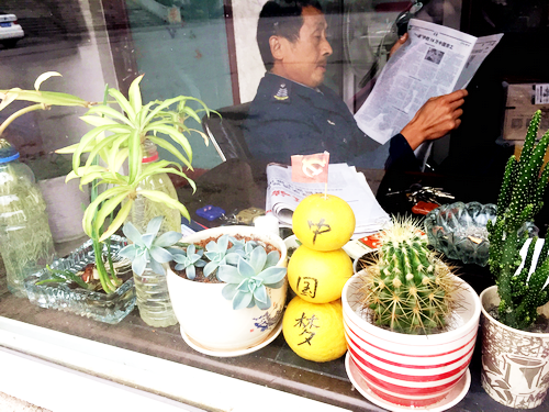 从门卫室出来,门卫大叔继续津津有味地看着报纸。阳光、花草、书刊,正好构成一幅美丽的图景。我赶紧拿起手机,透过窗户,记录下这个镜头。