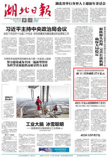 12月27日,省委宣传部“学习贯彻党的十九大精神,奋力谱写新时代湖北发展新篇章”第十场新闻发布会召开,聚焦供给侧结构性改革。我省“三去一降一补”效果明显,截至11月底,商品住房库存消化周期较去年底下降2.1个月,“营改增”实现净减税274.6亿元。