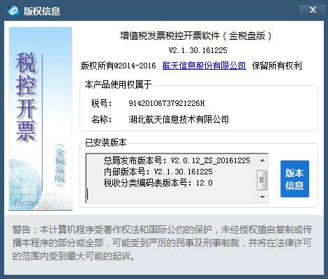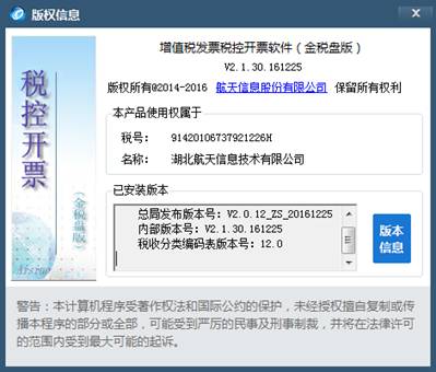 登录增值税发票税控开票软件(金税盘版)后,点击最上方的“帮助”——“关于”,会显示如下图的版权信息,如您的开票系统显示V