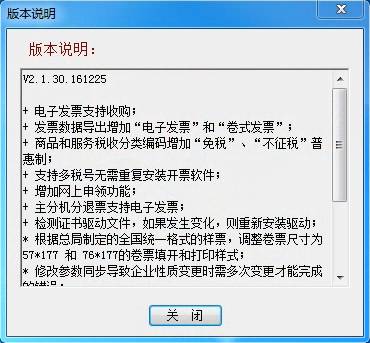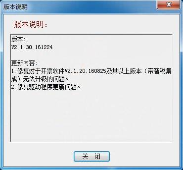 【第三步】点击“关闭”。 【第四步】更新成功后退出并重新打开开票软件,会自动下载1225版本更新包,下载成功后,出现1225版本的更新提示,点击确定按钮。