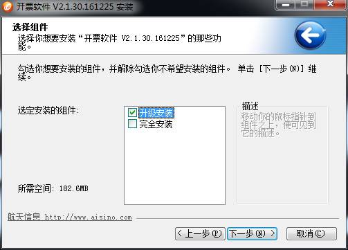 3、双击开票安装程序进行升级安装。系统默认为“升级安装”,请勿选择“完全安装”,按系统提示选择“下一步”直到“完成”。