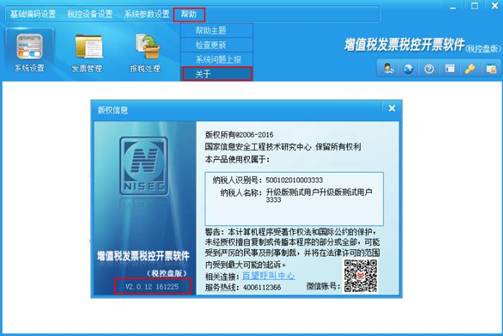 4、登录开票软件,点击最上方的“帮助”——“关于”,会显示如下图的版权信息,如您的开票系统显示为V