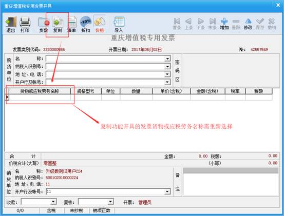 三、升级新版软件后开票注意事项 (一)复制开具注意事项 软件升级后,对于原先开具的发票不要使用复制开具功能。 如需使用复制功能进行发票开具,货物或应税劳务名称处需要进行重新选择。