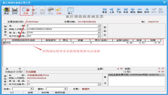 (二)负数发票开具注意事项 如企业需要冲红软件升级前的正数发票,在进行负数发票填开的界面。 货运或应税劳务名称需要双击进行重新选择后在进行发票打印。