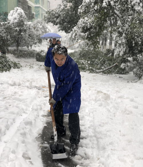 随州市积雪最深处超过20厘米,漫过脚踝,全市国税系统上共同抵御暴雪,1月4日一大早,领导班子和党员干部就拿起油铲清除冰雪,迅速杀出一条“雪路”,局长赵先锋刚刚参加完市里“两会”赶回机关,就立即参与到铲雪队伍,清理积雪压断的树枝,推送食堂运菜车辆,年近七旬的老局长王树叶顾不上午饭,拿着竹竿敲掉树上的积雪,确保纳税人办税和群众出行安全方便。(杨可)