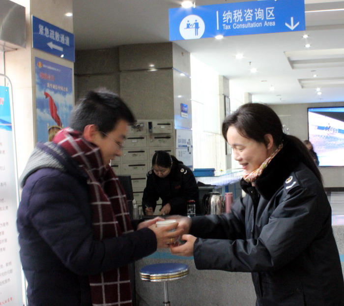 孝感市办税服务厅提前半小时打开空调,提升室内温度,让纳税人进门就感到温暖,准备毛巾、热水、姜茶等,为冒雪前来办业务的纳税人掸去身上积雪、递上热茶,在寒雪中送去温暖,让寒冷的冬天透着丝丝暖意,温暖纳税人的心。