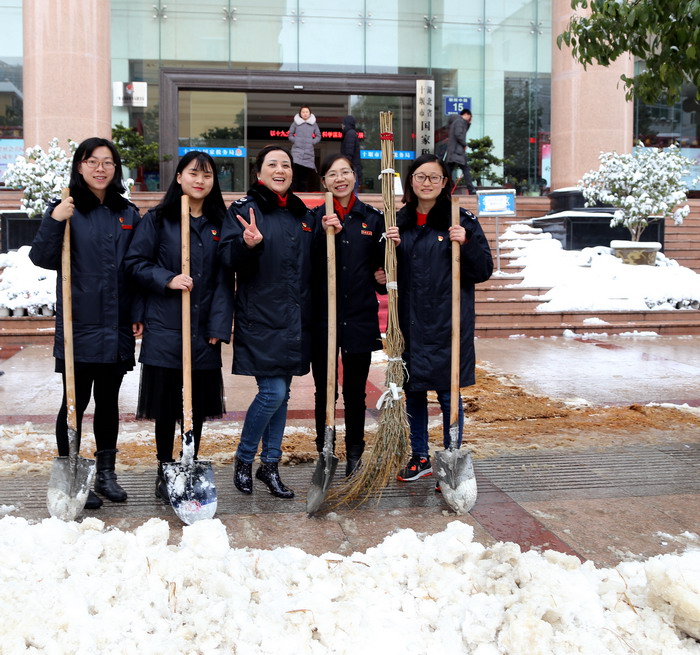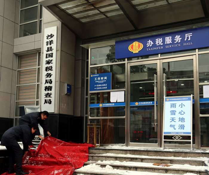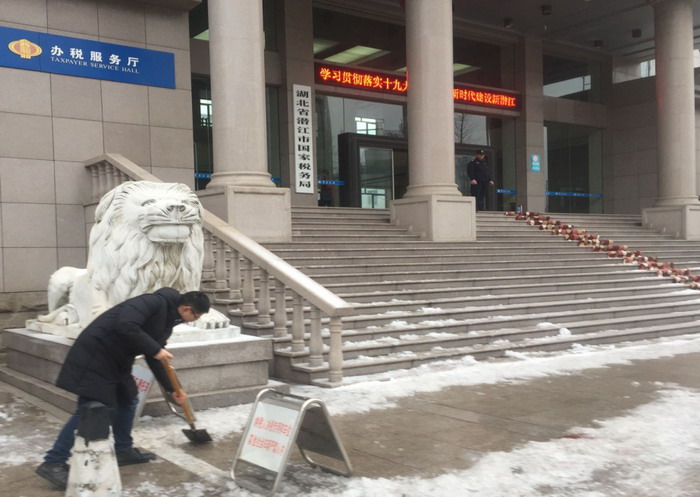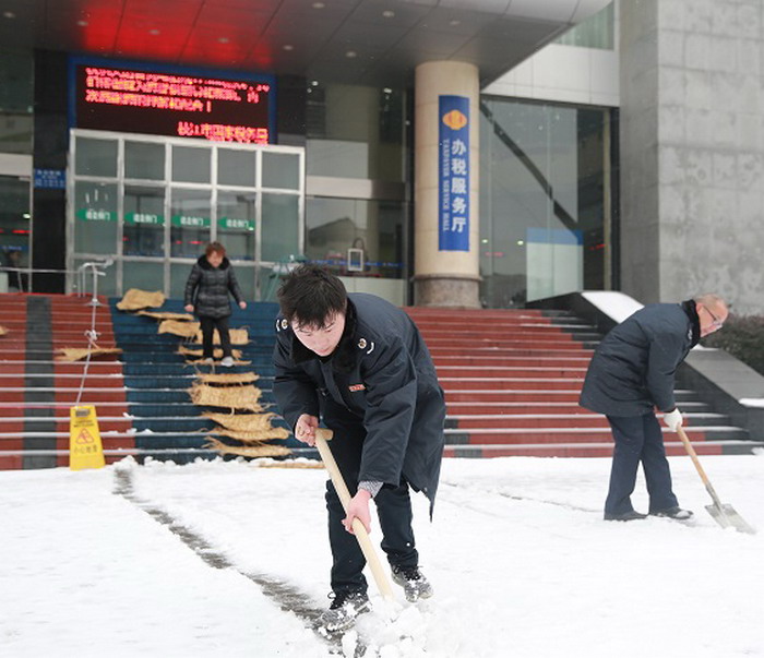 3日鄂西北喜降瑞雪,十堰中心城区积雪达到6-8厘米,气温降至零下5℃,一时间学校停课,公交停运,封锁道路、港口,十堰市国税系统800人清晨紧急动员,挥舞着扫帚和铁锹,清扫办税服务厅周边积雪,为纳税人提供干净、安全的通道,各办税服务厅导税人员提醒纳税人注意安全,搀扶行动不便的纳税人进出,在办税服务厅门口、易滑区域等地铺设防滑垫,张贴醒目标识,在税企QQ群、微信群告知纳税人合理安排时间错峰办税,安全出行。