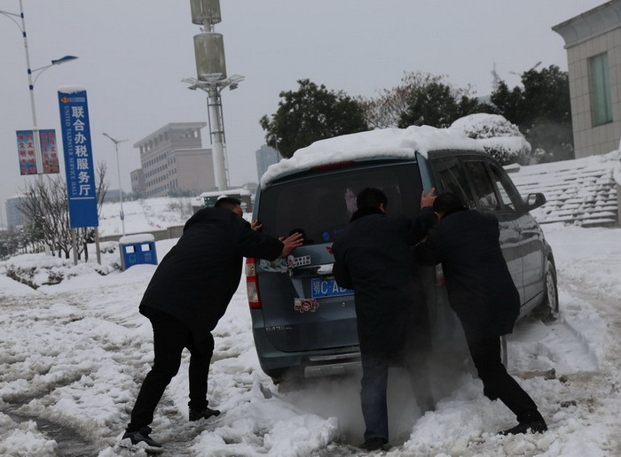 元月4日,有位纳税人驱车来丹江口市国税局办理发票业务,车轮陷入厚硬的凝冰中无法前行,3名国税人员立即去帮忙推车,齐心协力推了5分多钟,脸和双手冻得通红,才将车辆推到指定位置。