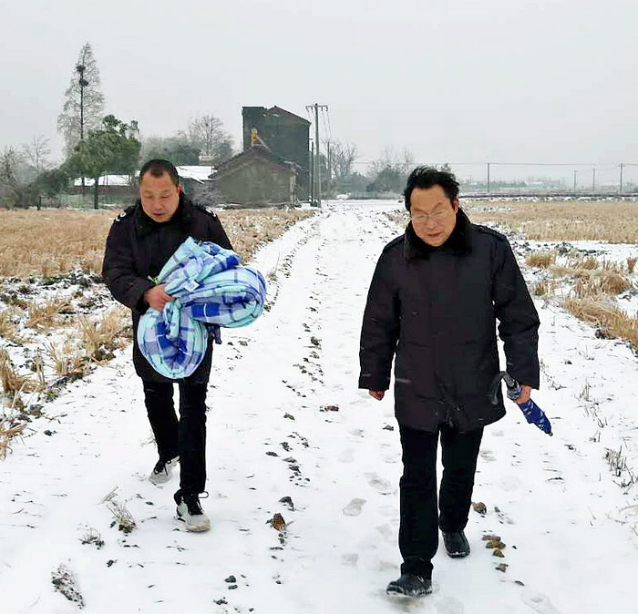 大雪封村,荆门市国税局工会主席龚广虎和直属税务分局扶贫驻村干部李虎,挂念着纪山镇更新村贫困户,准备好厚棉被送到贫困户唐诗应家中。唐诗应感动地说:“那么大的雪,你们还挂念着我,太谢谢了”。当天,扶贫人员为11户贫困户送去棉衣、棉被,让群众以温暖的内心抵御寒流,以崭新面貌和感恩情怀过“暖冬”。(魏晓倩)