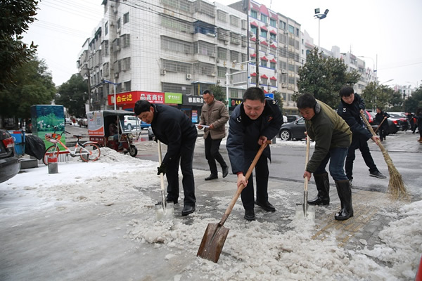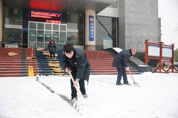 4日下午,枝江国税全局动员,80余名国税干部手持铁锹、扫帚等工具,对办税服务厅、行政大楼门前广场、创城社区责任区域的主要交通干道进行清扫,及时在路面撒盐,加速冰雪融化,铺设防滑草席,防止路面结冰对过往行人和车辆造成安全隐患。冰天雪地里国税干部个个干劲十足,不出两小时,主要街面的积雪被一一清除,确保了责任路段道路畅通。与此同时组织专班人员加强值守,对车辆停放状况、水电设施、各类建筑物等开展巡查,做好设施维护,确保隐患排查到边到角,做好应对情况及时汇报反馈,全面保障办税服务工作有序开展。